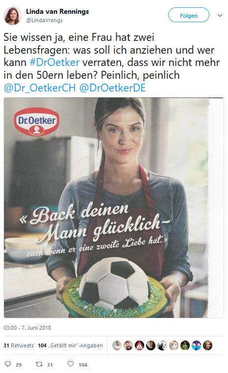 Fraglich ist, ob der Konzern wirklich in den 50er Jahren festsitzt und die Frau des 21. Jahrhunderts hinter dem Herd sieht, während der Mann Fußball schaut. Dass die Werbeaktion einfach unbedacht und naiv war, ist bei einem Mega-Konzern wie Dr. Oetker eigentlich unvorstellbar. Derart veraltete Frauenbilder zu vermarkten, kann auch strategisches Marketing gewesen sein, bei dem Dr. Oetker gezielt versucht hat, mit dem Werbe-Slogan die Massen zu provozieren. Wirklich präsent in den Medien war das Unternehmen in letzter Zeit auf jeden Fall nicht. Skandale bleiben außerdem eher im Gedächtnis als ein politisch korrekter Slogan zu einem Fußballkuchen. Wie dem auch sei, das Unternehmen hat die volle Aufmerksamkeit auf sich gelenkt.